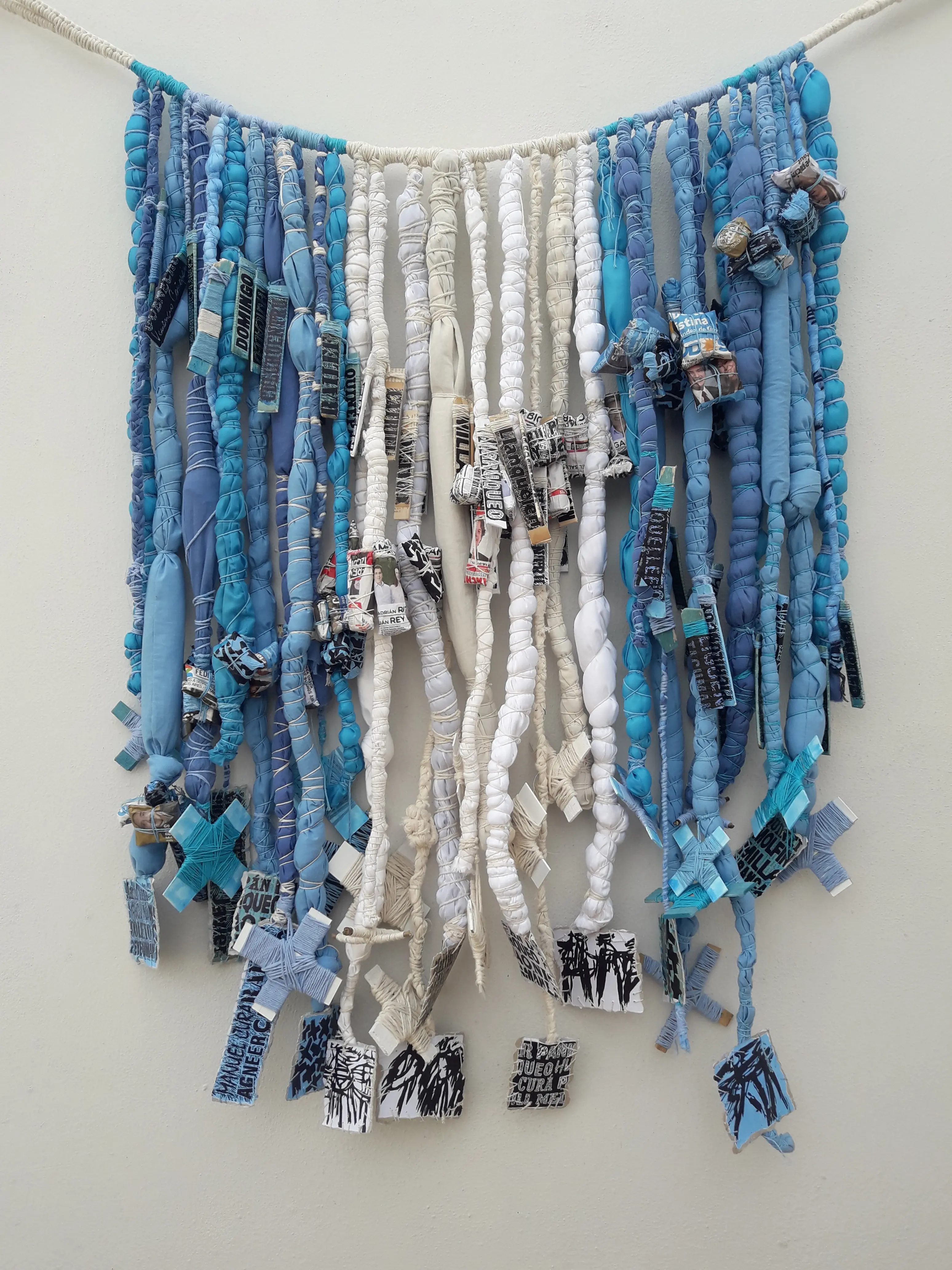 Quipu de telas e hilos trenzados y cosidos con inclusión de objetos e impresiones xilográficas.