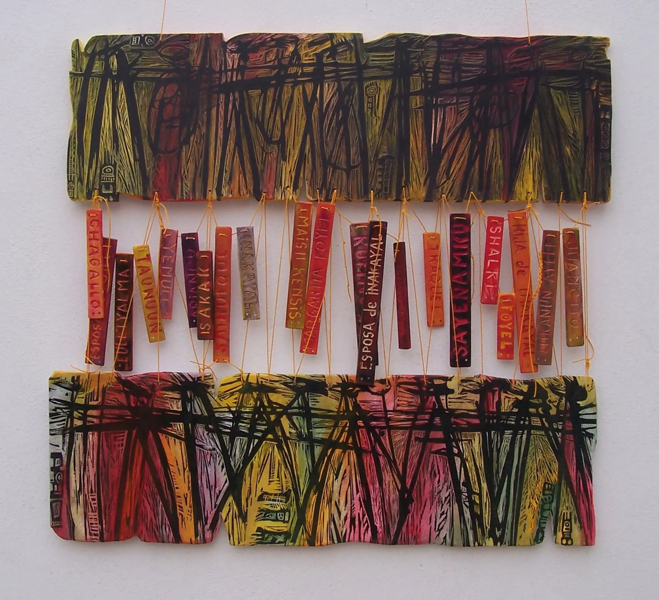 Taco xilográfico, estampa xilográfica adherida sobre MDF tallado, acrílicos, hilos.