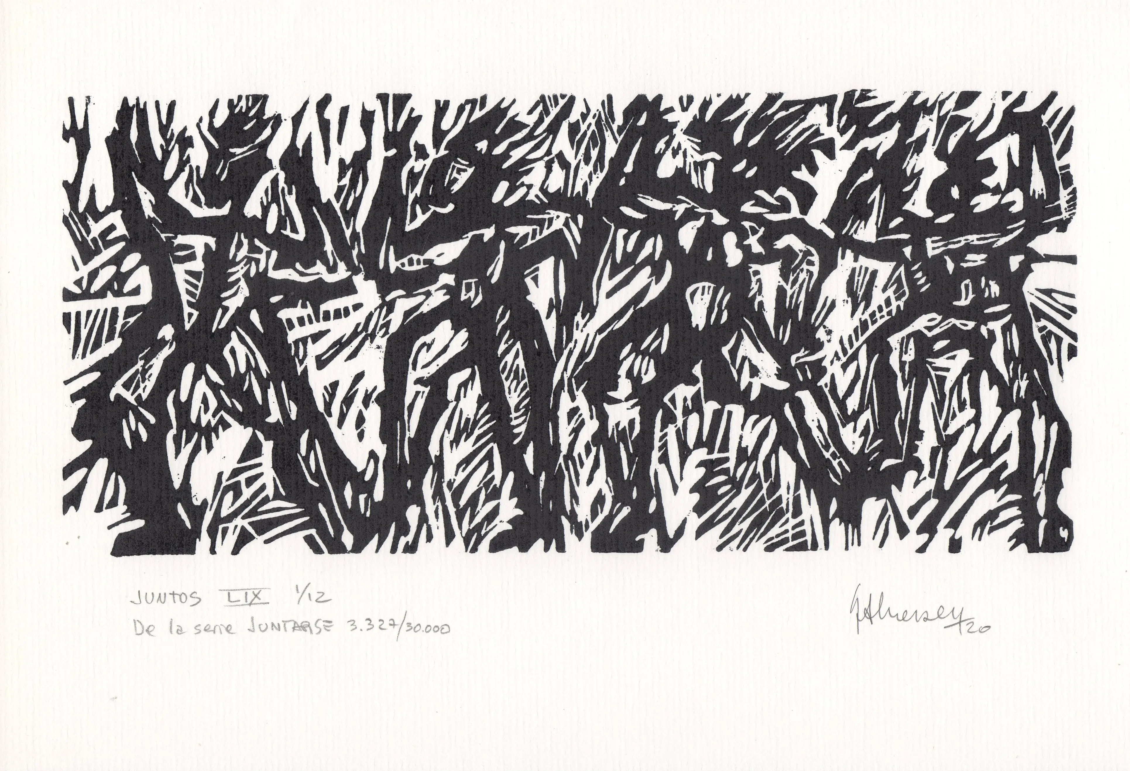 Una de las 59 xilografías que fueron grabadas, casi en su totalidad en el año 2010, pero que su estampación tradicional definitiva se realizó entre los años 2015 a 2020. Desde los inicios se realizaron copias sobre soportes diferentes, para ser utilizadas en la serie de trabajos que integran el proyecto Caciques, el que se halla comprendido en el proyecto abarcativo JUNTARSE 30.000. Todos los tacos son de 10 x 22 cm. y la edición tradicional de 12 ejemplares, se realizó sobre papel de 17 x 25 cm.