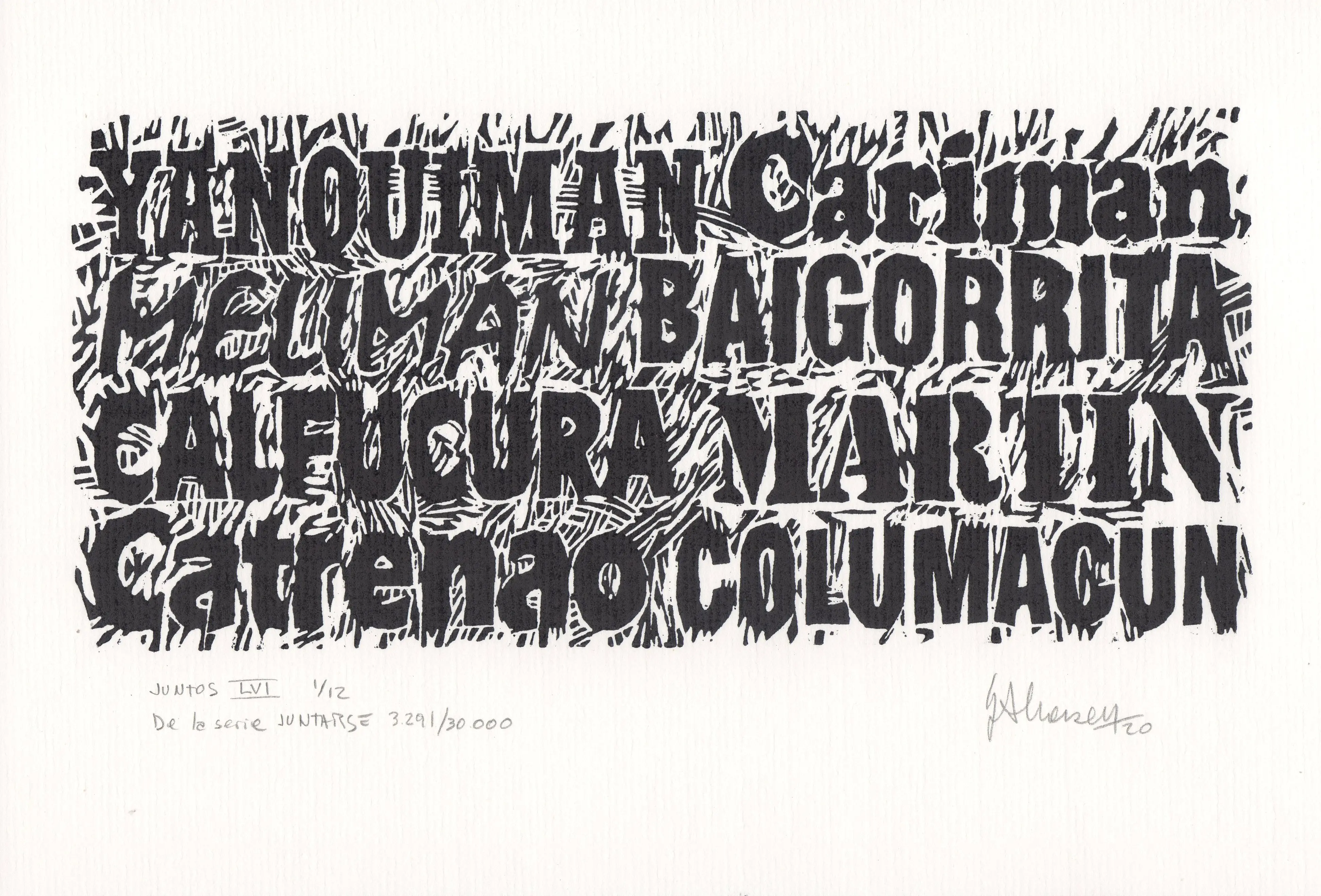 Una de las 59 xilografías que fueron grabadas, casi en su totalidad en el año 2010, pero que su estampación tradicional definitiva se realizó entre los años 2015 a 2020. Desde los inicios se realizaron copias sobre soportes diferentes, para ser utilizadas en la serie de trabajos que integran el proyecto Caciques, el que se halla comprendido en el proyecto abarcativo JUNTARSE 30.000. Todos los tacos son de 10 x 22 cm. y la edición tradicional de 12 ejemplares, se realizó sobre papel de 17 x 25 cm.