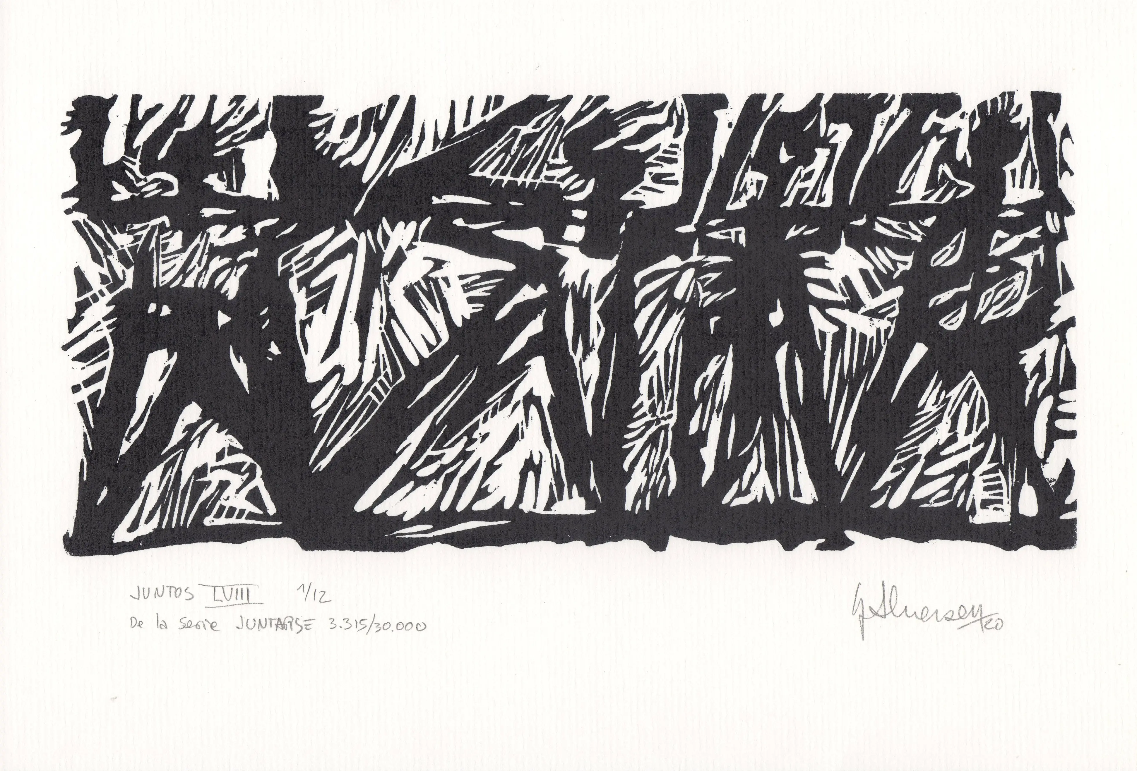 Una de las 59 xilografías que fueron grabadas, casi en su totalidad en el año 2010, pero que su estampación tradicional definitiva se realizó entre los años 2015 a 2020. Desde los inicios se realizaron copias sobre soportes diferentes, para ser utilizadas en la serie de trabajos que integran el proyecto Caciques, el que se halla comprendido en el proyecto abarcativo JUNTARSE 30.000. Todos los tacos son de 10 x 22 cm. y la edición tradicional de 12 ejemplares, se realizó sobre papel de 17 x 25 cm.