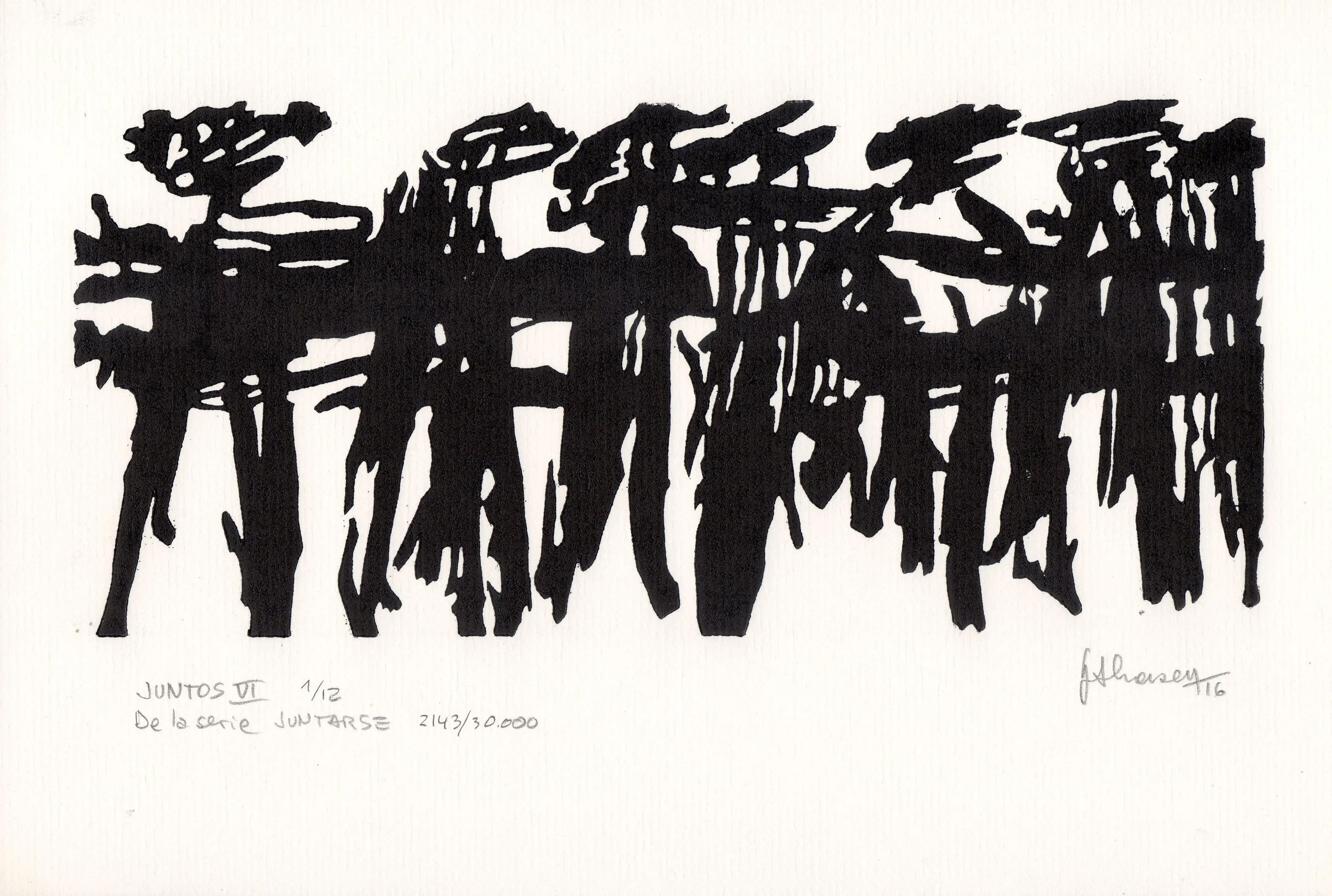 Una de las 59 xilografías que fueron grabadas, casi en su totalidad en el año 2010, pero que su estampación tradicional definitiva se realizó entre los años 2015 a 2020. Desde los inicios se realizaron copias sobre soportes diferentes, para ser utilizadas en la serie de trabajos que integran el proyecto Caciques, el que se halla comprendido en el proyecto abarcativo JUNTARSE 30.000. Todos los tacos son de 10 x 22 cm. y la edición tradicional de 12 ejemplares, se realizó sobre papel de 17 x 25 cm.