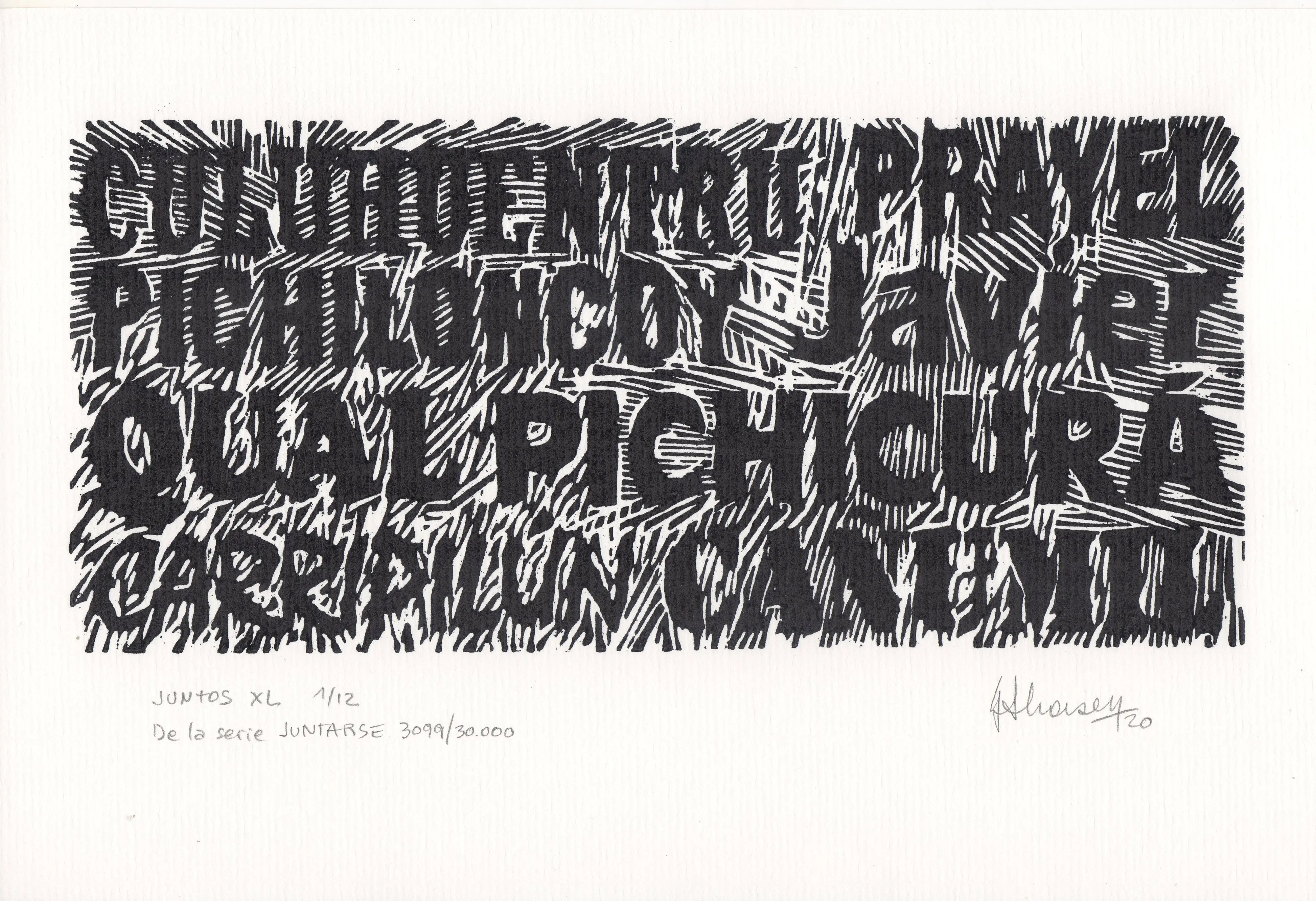 Una de las 59 xilografías que fueron grabadas, casi en su totalidad en el año 2010, pero que su estampación tradicional definitiva se realizó entre los años 2015 a 2020. Desde los inicios se realizaron copias sobre soportes diferentes, para ser utilizadas en la serie de trabajos que integran el proyecto Caciques, el que se halla comprendido en el proyecto abarcativo JUNTARSE 30.000. Todos los tacos son de 10 x 22 cm. y la edición tradicional de 12 ejemplares, se realizó sobre papel de 17 x 25 cm.
