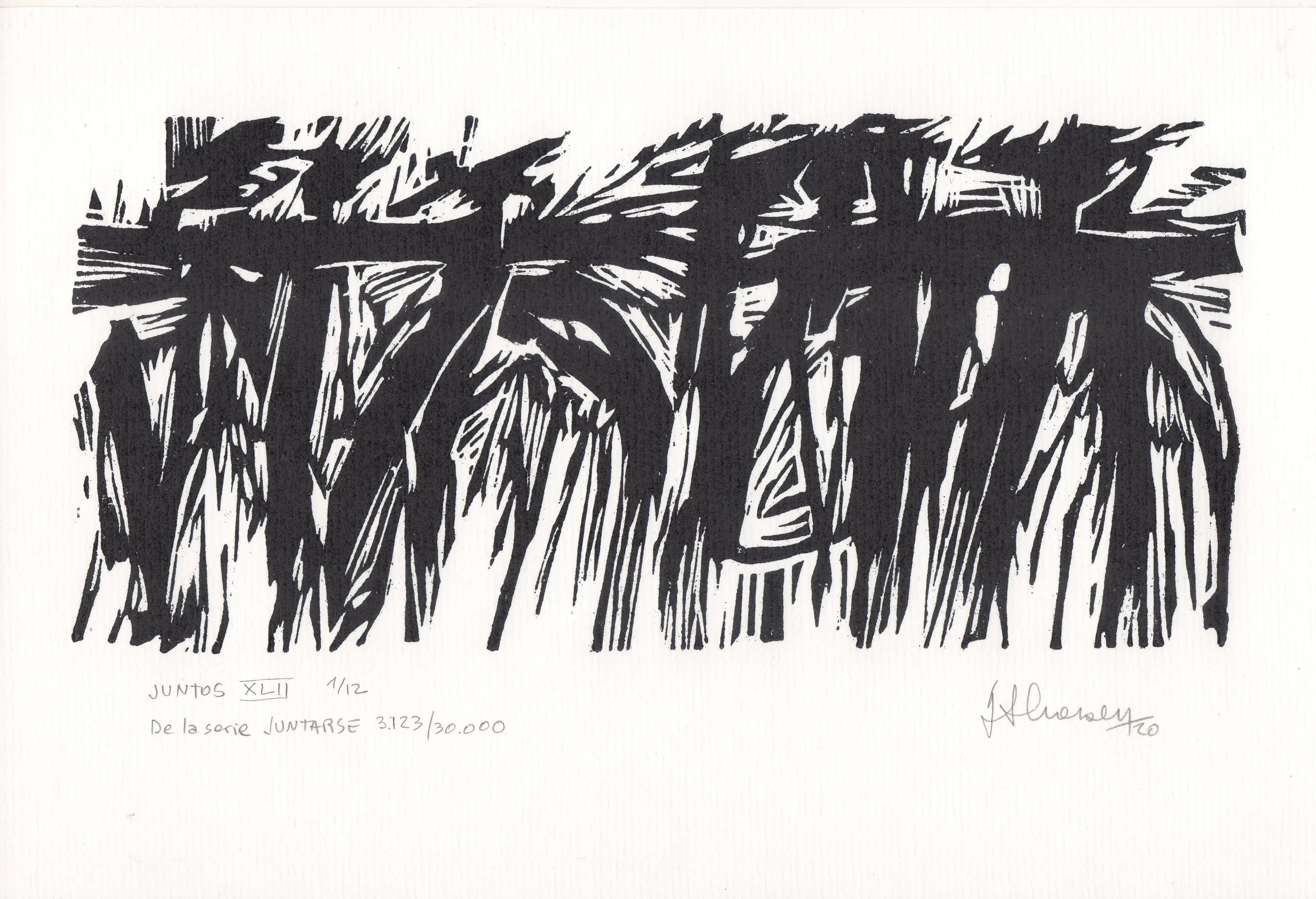 Una de las 59 xilografías que fueron grabadas, casi en su totalidad en el año 2010, pero que su estampación tradicional definitiva se realizó entre los años 2015 a 2020. Desde los inicios se realizaron copias sobre soportes diferentes, para ser utilizadas en la serie de trabajos que integran el proyecto Caciques, el que se halla comprendido en el proyecto abarcativo JUNTARSE 30.000. Todos los tacos son de 10 x 22 cm. y la edición tradicional de 12 ejemplares, se realizó sobre papel de 17 x 25 cm.