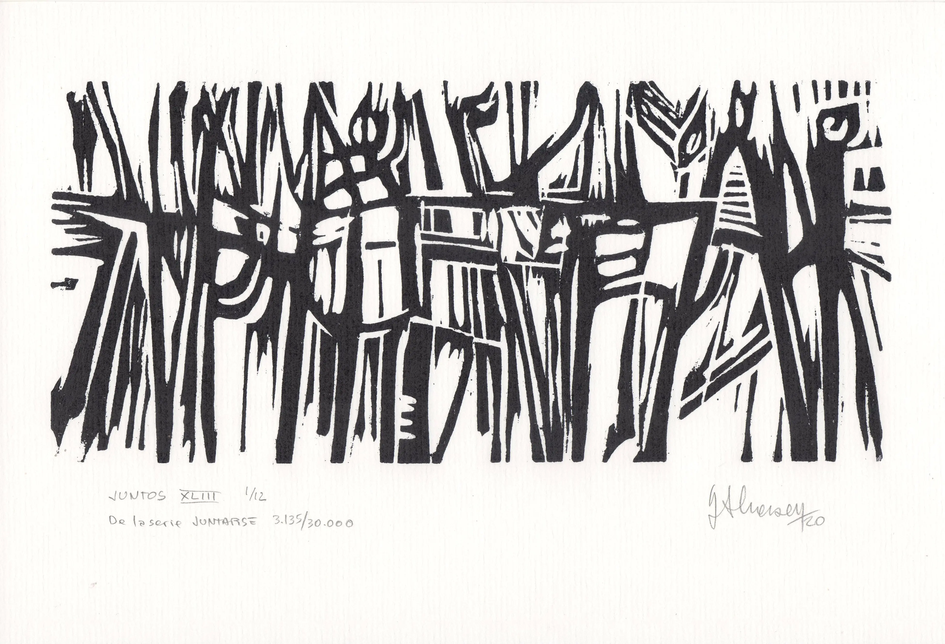 Una de las 59 xilografías que fueron grabadas, casi en su totalidad en el año 2010, pero que su estampación tradicional definitiva se realizó entre los años 2015 a 2020. Desde los inicios se realizaron copias sobre soportes diferentes, para ser utilizadas en la serie de trabajos que integran el proyecto Caciques, el que se halla comprendido en el proyecto abarcativo JUNTARSE 30.000. Todos los tacos son de 10 x 22 cm. y la edición tradicional de 12 ejemplares, se realizó sobre papel de 17 x 25 cm.