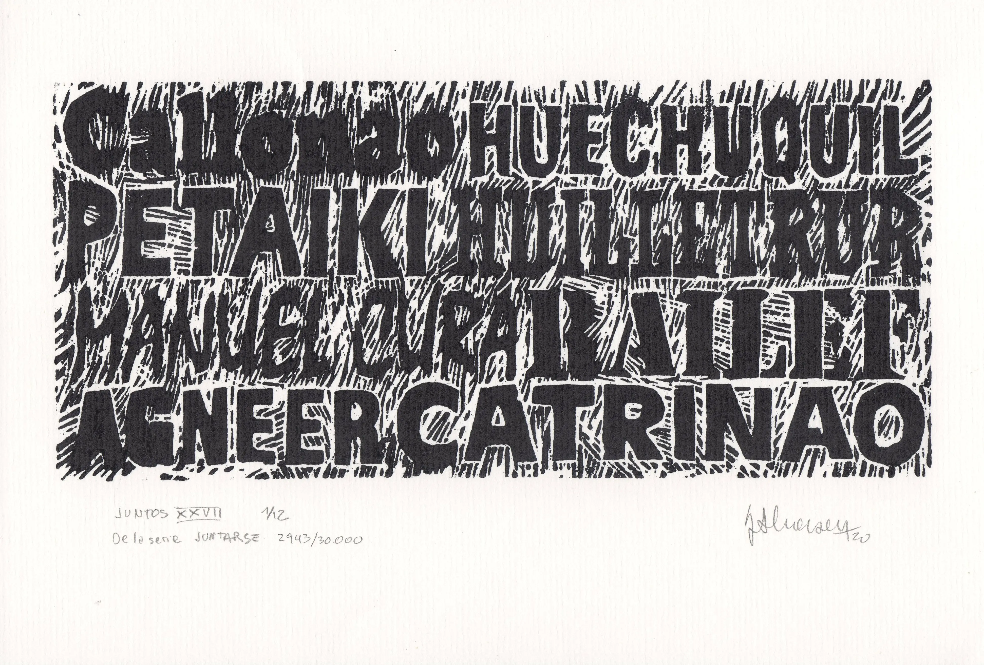 Una de las 59 xilografías que fueron grabadas, casi en su totalidad en el año 2010, pero que su estampación tradicional definitiva se realizó entre los años 2015 a 2020. Desde los inicios se realizaron copias sobre soportes diferentes, para ser utilizadas en la serie de trabajos que integran el proyecto Caciques, el que se halla comprendido en el proyecto abarcativo JUNTARSE 30.000. Todos los tacos son de 10 x 22 cm. y la edición tradicional de 12 ejemplares, se realizó sobre papel de 17 x 25 cm.
