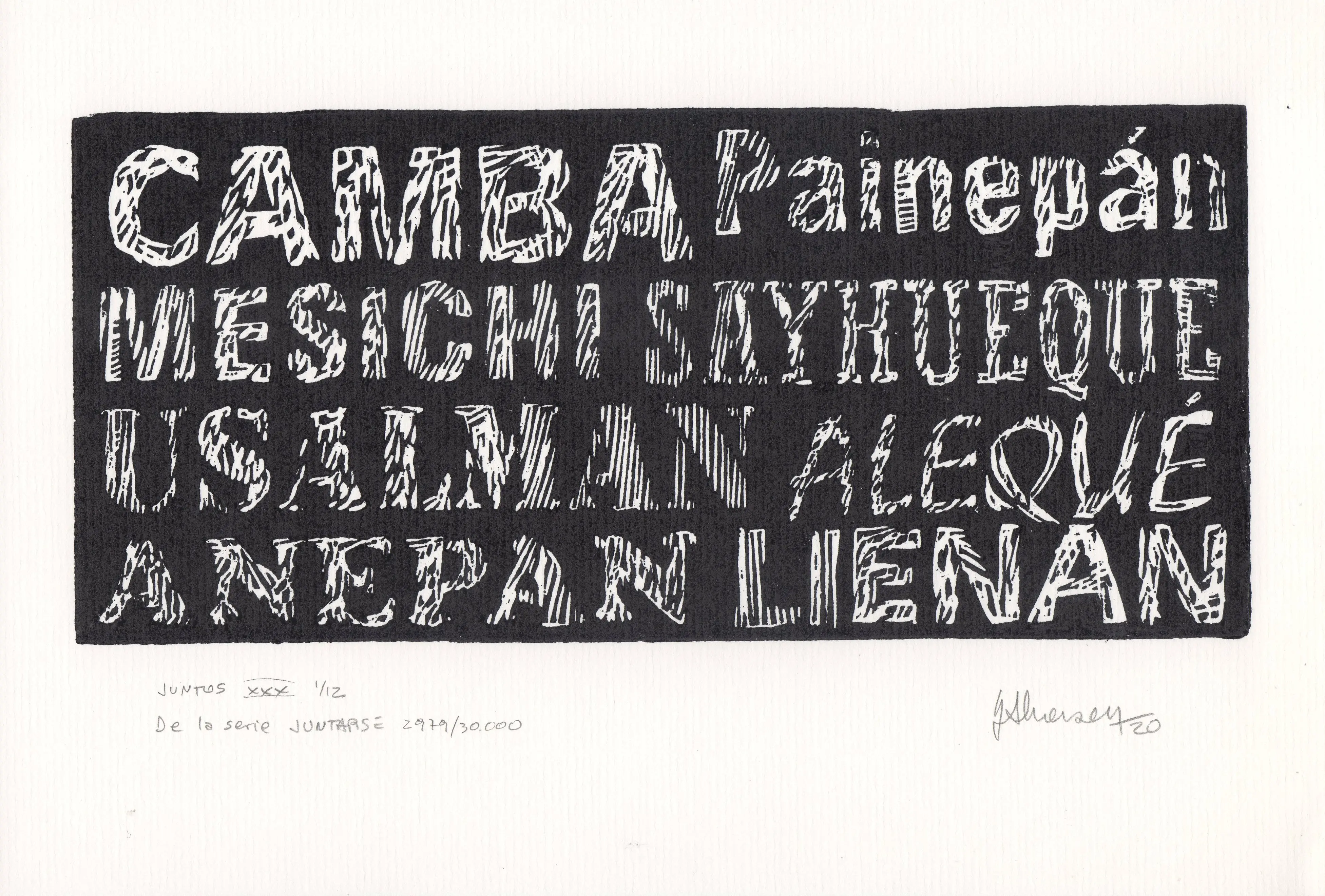 Una de las 59 xilografías que fueron grabadas, casi en su totalidad en el año 2010, pero que su estampación tradicional definitiva se realizó entre los años 2015 a 2020. Desde los inicios se realizaron copias sobre soportes diferentes, para ser utilizadas en la serie de trabajos que integran el proyecto Caciques, el que se halla comprendido en el proyecto abarcativo JUNTARSE 30.000. Todos los tacos son de 10 x 22 cm. y la edición tradicional de 12 ejemplares, se realizó sobre papel de 17 x 25 cm.