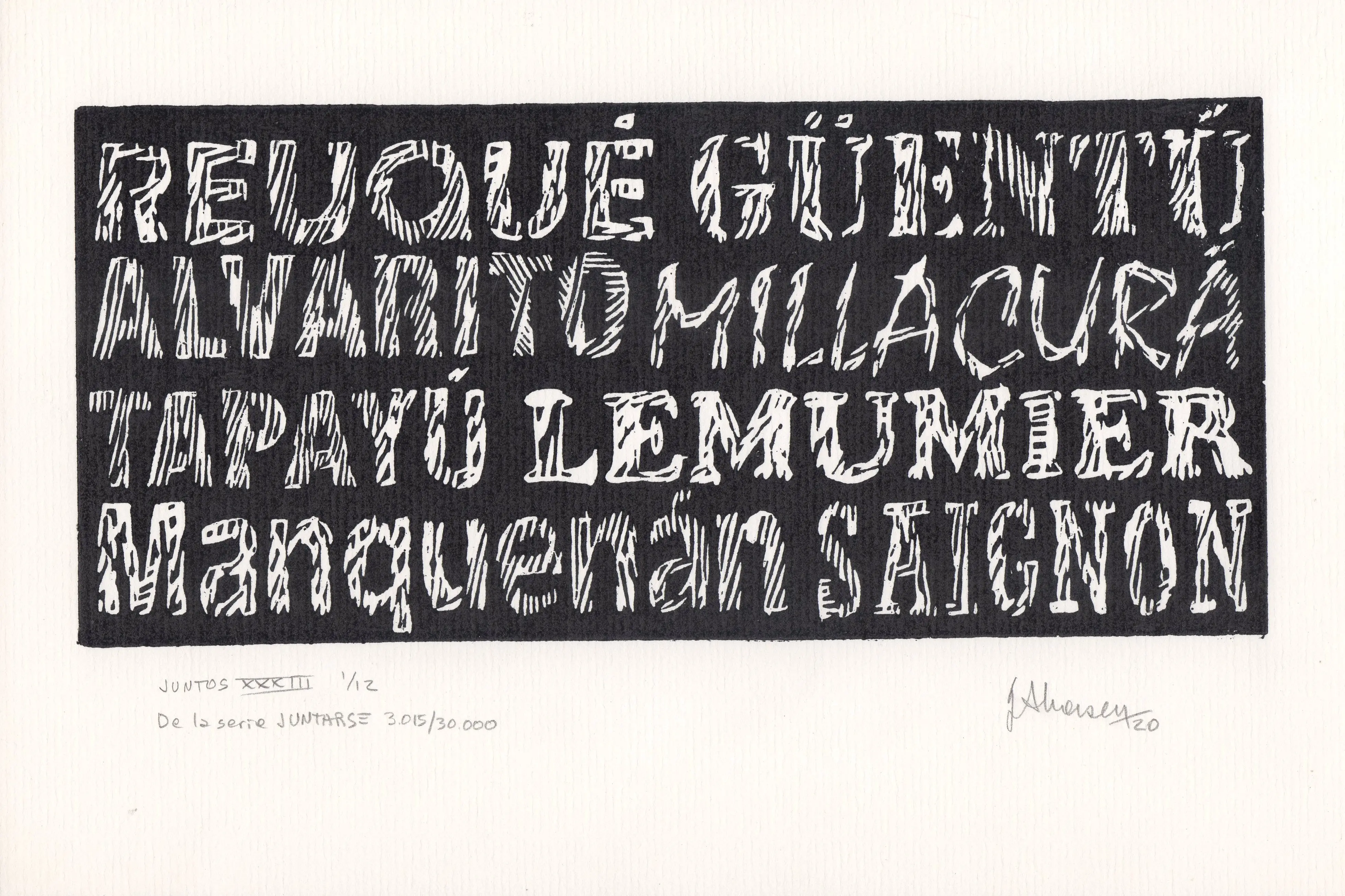 Una de las 59 xilografías que fueron grabadas, casi en su totalidad en el año 2010, pero que su estampación tradicional definitiva se realizó entre los años 2015 a 2020. Desde los inicios se realizaron copias sobre soportes diferentes, para ser utilizadas en la serie de trabajos que integran el proyecto Caciques, el que se halla comprendido en el proyecto abarcativo JUNTARSE 30.000. Todos los tacos son de 10 x 22 cm. y la edición tradicional de 12 ejemplares, se realizó sobre papel de 17 x 25 cm.