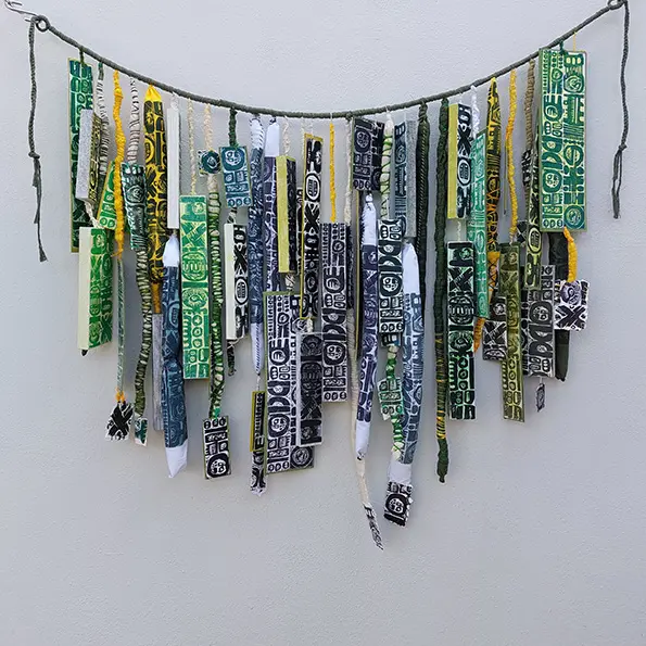 Xilografías incluidas en objeto textil. Papel, tela, hilo, cartón.