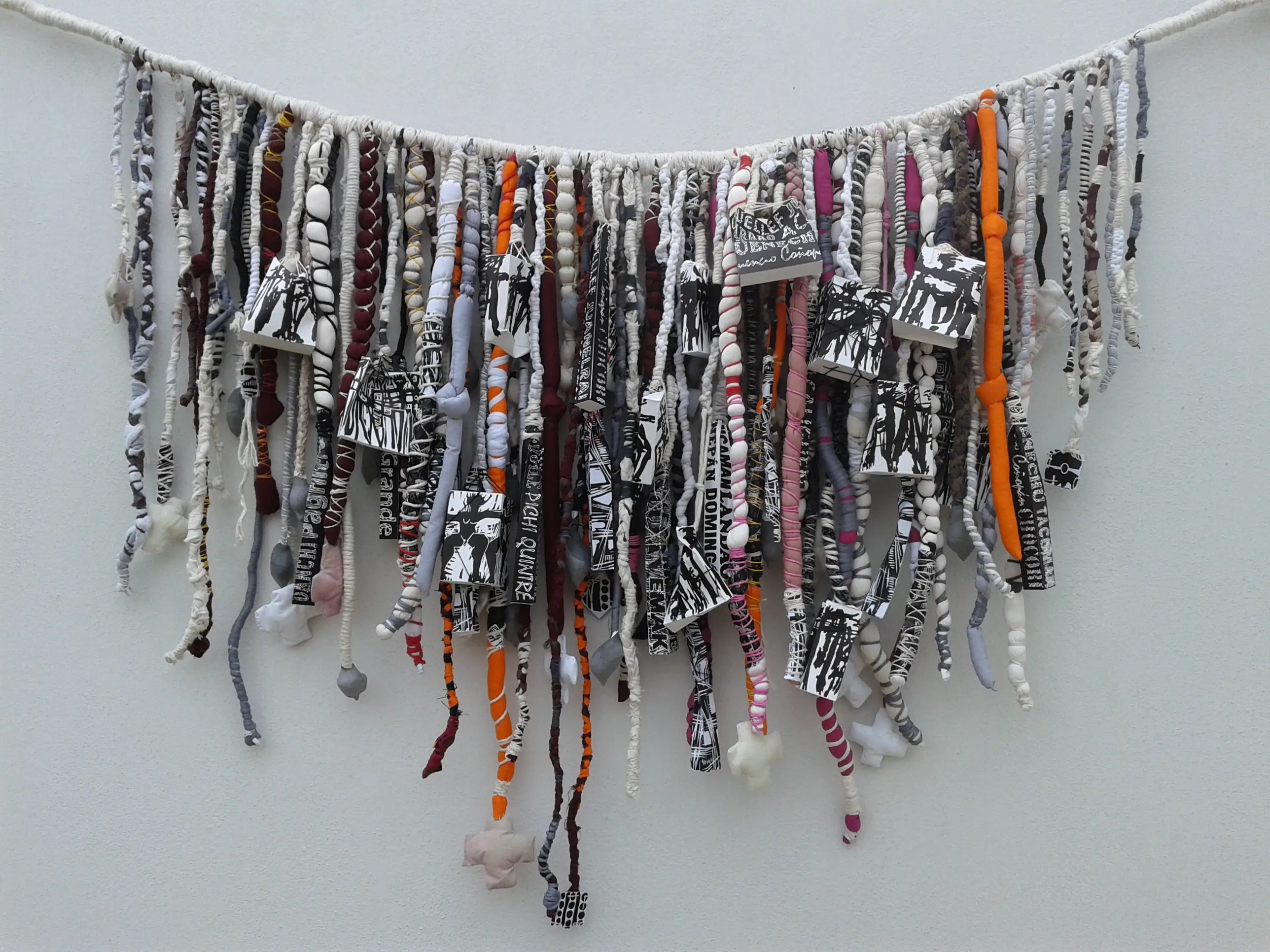 Textil (quipu) ensamble. Telas, hilos, Xilografías, yeso.