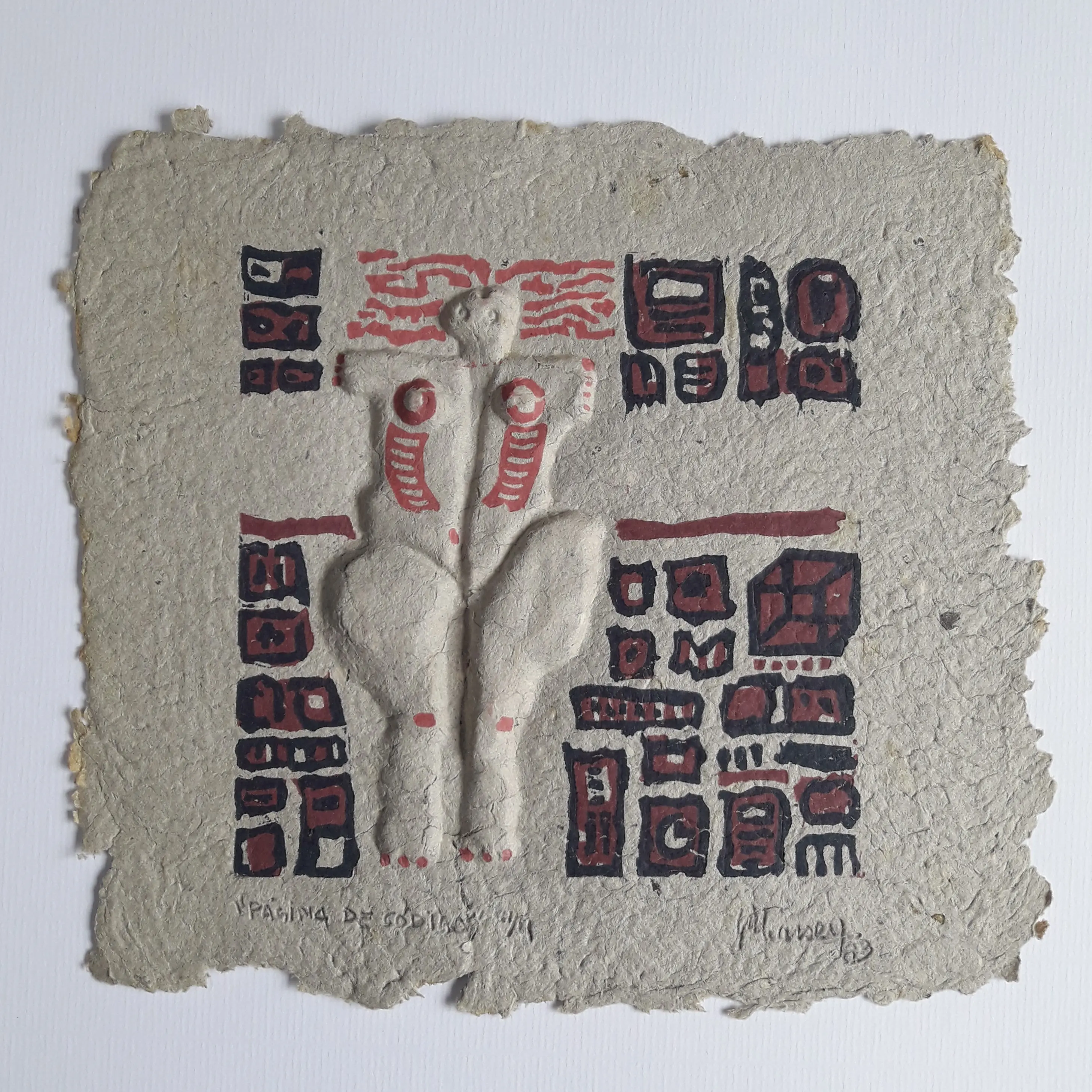 Trabajo donde una figura en relieve se complementa con grafismos realizados con xilografías.