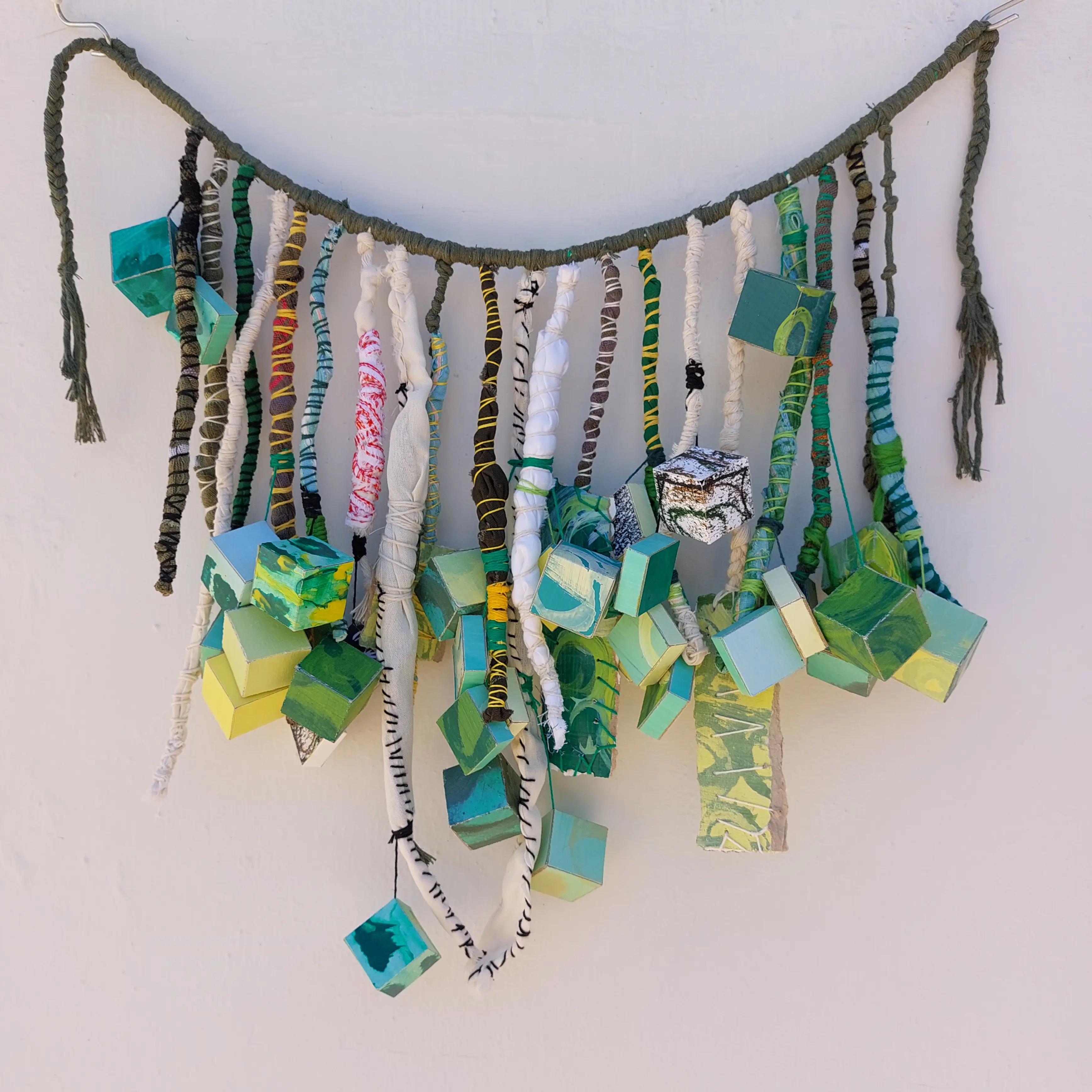 Objeto textil con inclusión de volúmenes de papel pintados con acrílicos.