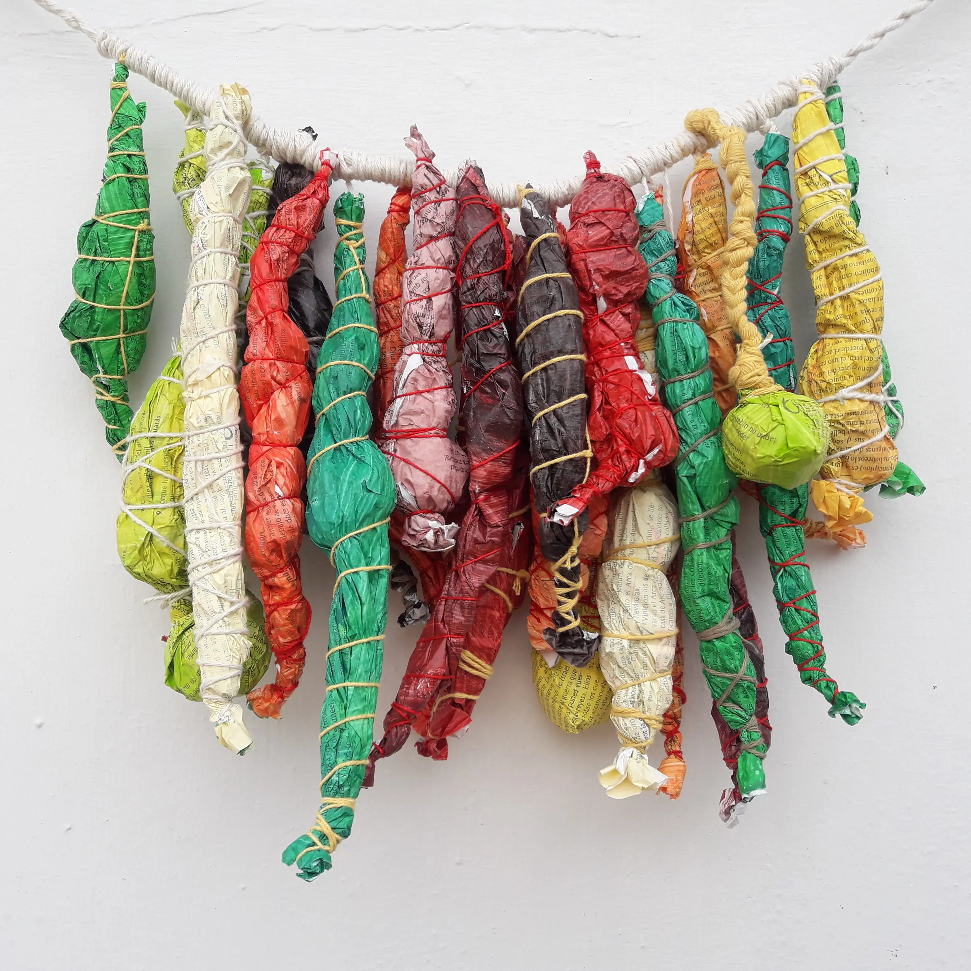Pocos códices prehispánicos han subsistido después del trágico encuentro entre civilizaciones que se iniciara en 1492. Quedaron en manos de aquellos que no podían interpretarlos, y que los conservaron como suntuosos objetos exóticos. Hoy están en museos, bibliotecas, colecciones y es constante el estudio que de ellos se hace, lo que contribuye a comprender, trabajosamente, aquello que fue destruido. Cientos de años más tarde desarmé una Biblia, en la soledad de mi taller, para utilizar las consecuencias del desguace en varios trabajos. Este quipu es consecuencia de esa búsqueda por rescatar las voces originarias de estas tierras. El 12 de julio de 1562 Fray Diego de Landa destruyó varios códices en el recordado Auto de fe de Mani. En lugar de destruir yo transformo, busco desviar la mirada para contribuir a crear una nueva sociedad que sea verdaderamente respetuosa de las diferencias.