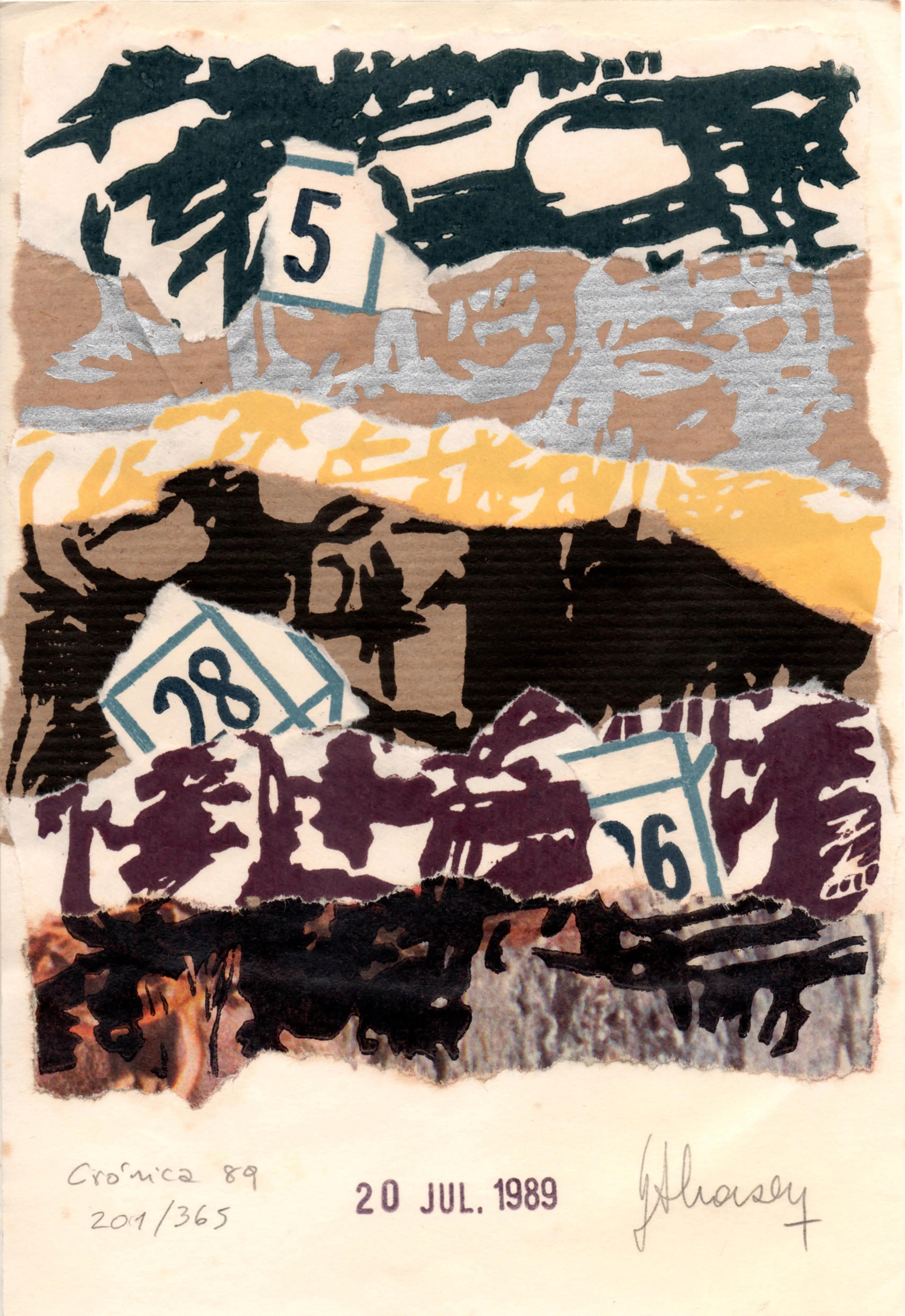 En el año 1989 mi amigo Carlos Pamparana me ofrece participar con un grabado en la revista que él editaba “Revista gráfica experimental 486”. Preparo para tal efecto una xilografía, la que, a través de un conjunto de signos, intentaba representar un año. Realizo una considerable cantidad de estampas sobre papeles de diferentes calidades y tintas de colores diversos. La idea era conformar 365 collages con partes de estampas, pero siempre rearmando la imagen, como si fuese un rompecabezas. Estos trabajos llevarían el nombre Crónica 89, irían numerados desde el 1/365 al 365/365 y llevarían además un sello con las fechas de cada día, desde el 1 ENERO 1989 al 31 DIC 1989. Realicé los primeros 200 collages necesarios para incluir en la revista, dado que esa era la cantidad de ejemplares que se realizaban, pero la revista nunca pudo concretarse. El tiempo quedó detenido. Las restantes 165 imágenes tampoco las finalicé nunca, aunque conservé el material para hacerlas. Aquí el tiempo se interrumpió, quedó latente. En el año 2019 fallece Carlos, su sorpresiva partida produjo en la comunidad artística un dolor profundo. Las 200 imágenes están en un baúl como parte de una interesante colección de grabados que resguarda su familia. Cuando se genera la propuesta bajo el tema “Tiempo sin tiempo” en la 22° trienal de Grenchen, entendí que era una óptima oportunidad para dar un cierre a esta historia. Con parte de las olvidadas estampas ya amarilleadas hice ahora 12 collages que titulé Tiempo de amistad. Las vivencias, las historias, los años compartidos se agolpan, entrelazan y confunden. Todo está allí, cual un transcurrir que se relata para revivirse y compartir.